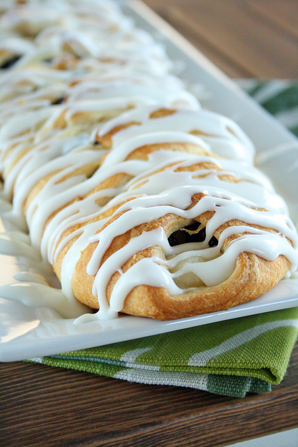 4. Once danish has cooled, remove to serving platter. In a small bowl, mix together powdered sugar, vanilla and cream to create icing. You may need to add more cream to get the desired consistency. Drizzle icing over danish. Cut into pieces and serve.