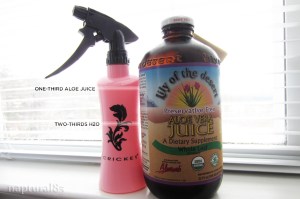 I fill my spray bottle with two-thirds water and one-third aloe vera juice. Then give my hair a light spritz every morning and night, just enough to penetrate my strands, but not enough to make my hair soaking wet, so it doesn’t ruin my style. I add the aloe vera juice because of it’s amazing healing properties. It also helps to ease frizz and calms the ends of your hair.