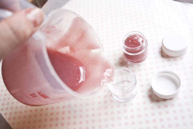 Use an old marinade injector or pour mixture into your lip gloss containers and leave to solidify – a couple hours