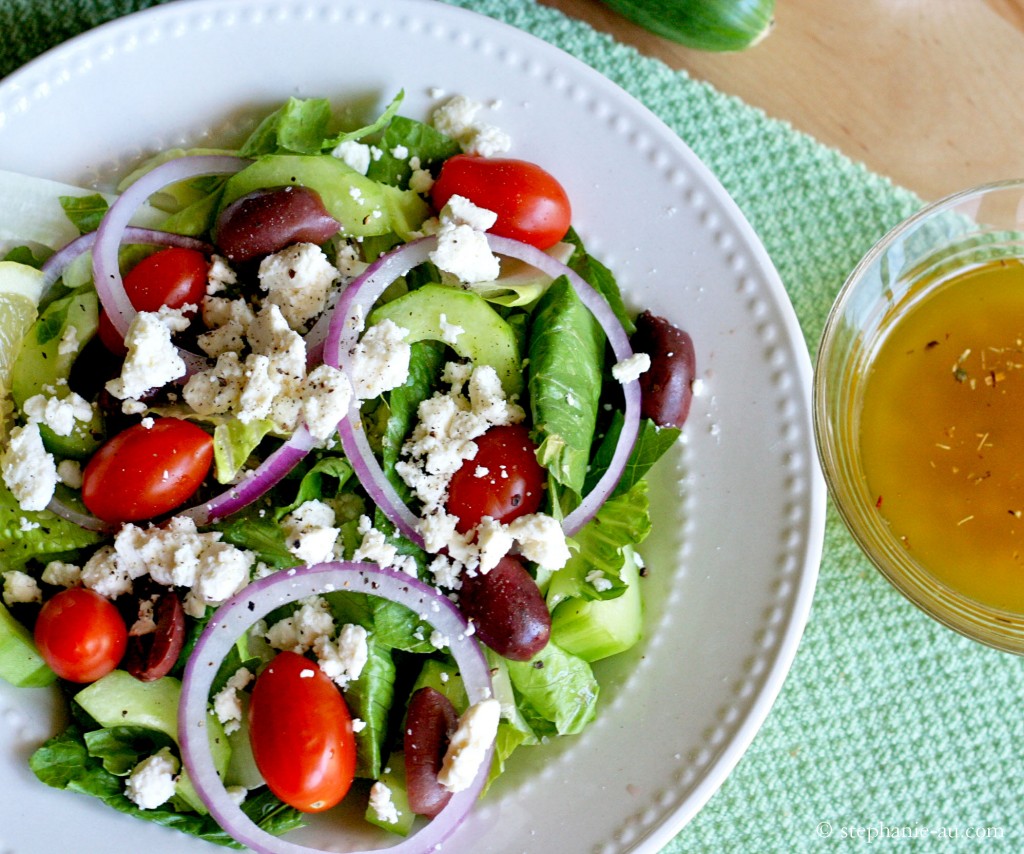3. Toss salad with prepared dressing and garnish with fresh feta cheese. Salt and pepper to taste.