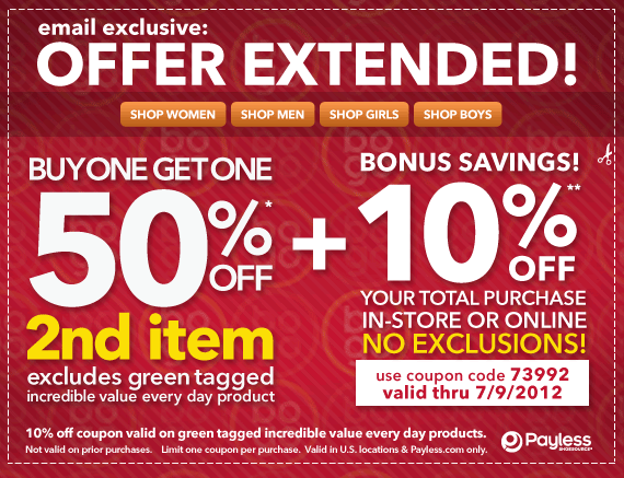 ** 10% off your total purchase. LIMIT ONE COUPON PER PURCHASE. Present your coupon in-store, or to redeem atwww.payless.com enter coupon code at checkout, to receive an additional 10% off your next footwear or accessory purchase. Offer may be used only once. Coupon not transferable and cannot be combined with other discounts or promotional codes. Coupon valid in U.S. only and is not redeemable at Shopko® locations and where otherwise restricted, prohibited or taxed. Offer excludes gift cards and is not valid on prior purchases. Void if copied, altered, transferred, purchased or sold; codes may not be posted or obtained on Internet. Cash value 1/50 cent. Coupon code 73992. Valid through 7/9/2012.